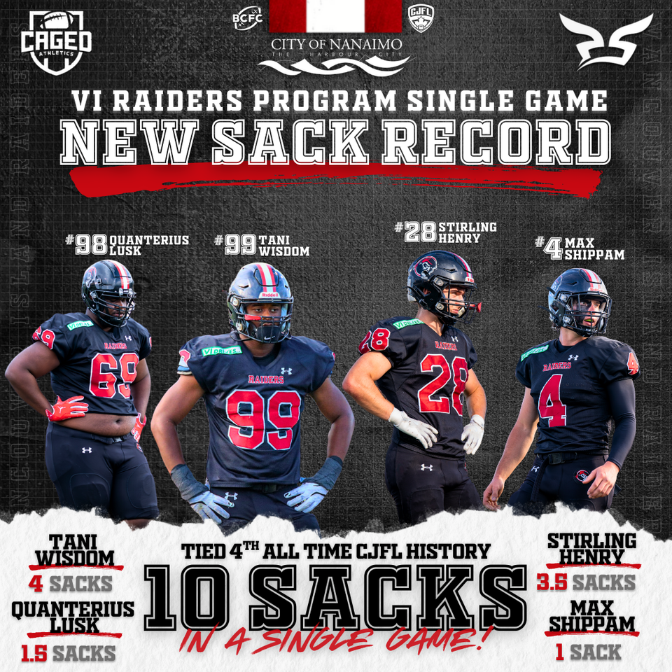 The victory was fueled by a dominant and historic defensive performance. The Raiders defense racked up 10 sacks, setting a new program record for sacks in a single game and tying for 4th all-time in Canadian Junior Football League (CJFL) history.
